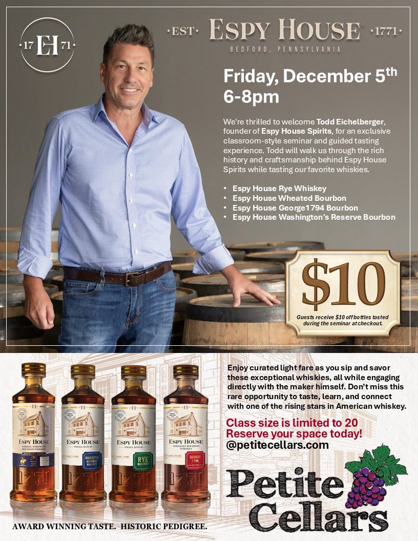 Join us at Petite Cellars on Friday, December 5th from 6–8 PM as we welcome Todd Eichelberger, founder of Espy House Spirits, for an exclusive classroom-style seminar and guided whiskey tasting.
